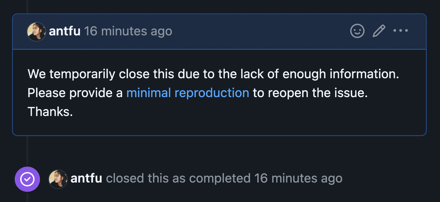 在我看来,要求最小重现是在要求使用者与维护者所花费的努力的公平。如果每个人都能在提 Issue 之前可以花一些时间创建一个最小重现,合集下来就能为维护者节省数百个小时(这甚至可以帮助使用者自己找到解决方案/错误,以至于不再需要提 Issue)。一个经过充分调查和解释的 Issue 也会让维护者更愿意花时间和精力处理。